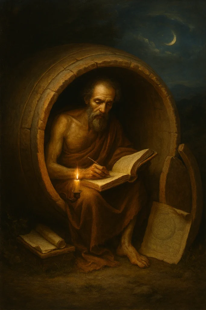 A férfi nem hajléktalan, hanem választott filozófus. A könyv, amit olvas, egy társadalmi utópiát vázol fel, ahol az emberek nem versengenek, hanem együtt gondolkodnak. A gyertya fénye a tudás, a térkép pedig a jövő útja. A kutya, amely a hordó mellett fekszik, Diogenész legendás társát idézi, aki a hűség és az ösztönös bölcsesség megtestesítője. A háttérben a csillagos ég és a hold azt sugallja: még a legsötétebb időkben is van fény, ha van gondolat.